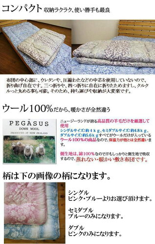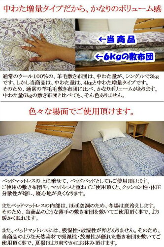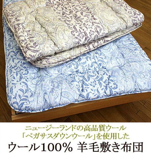 増量タイプ ウール敷き布団 ダブルサイズ サイズ:140×200cm 側生地:綿100% 中わた:ニュージーランド羊毛(ペガサスダウンウール) 充てん量:5,6kg ↓店長より一言!この商品のお勧めポイント↓ 吸湿性に優れた羊毛わたを100%使用した、増量タイプ ウール敷き布団です。