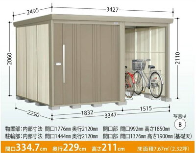 サイズ・仕様 床面積 7.67m2(2.32坪) 床耐荷重 2520 kg 外部寸法 間口3347×奥行2290×高さ2110 内部寸法 【物置部】 間口1776×奥行2120×高さ1868 【開放部】 間口1444×奥行2120×高さ1868 必要ブロック 20コ(配送のみの場合別途) 付属品 棚 HT-12LW/HT-05W たて樋(2本) アンカープレート 本州・四国・九州は送料無料 (メーカー直送) 北海道・沖縄・他離島への配送は承っておりません。